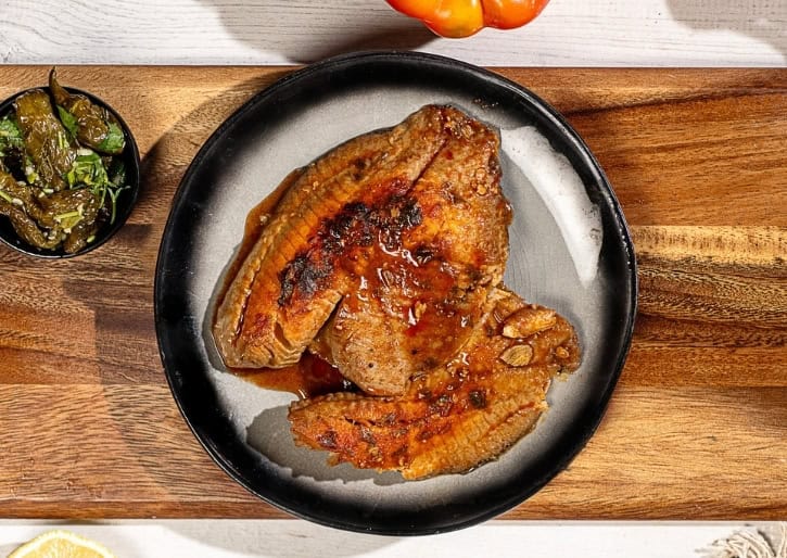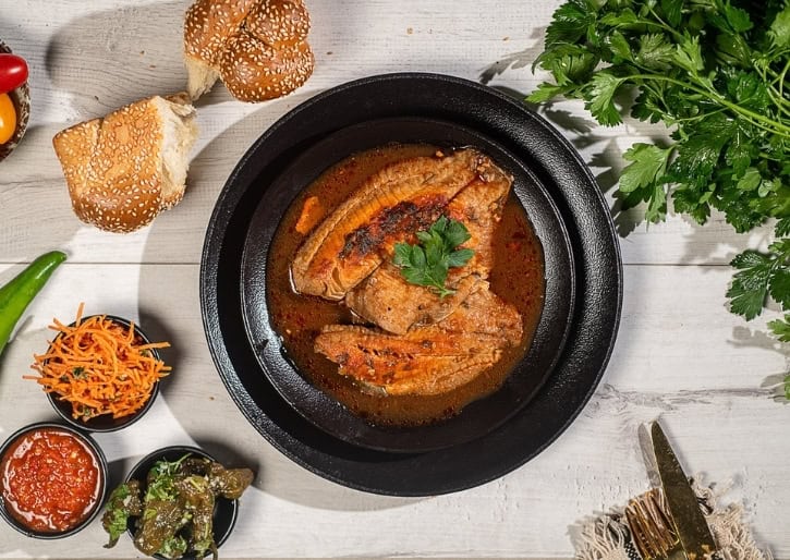פילה דג מושט ברוטב בסגנון מרוקאי. פילה דג מושט מבושל ברוטב מרוקאי קלאסי.